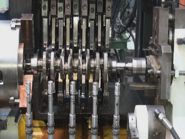 3.滾壓四缸機曲軸:滑臺橫向進給,九個夾鉗油缸通過滾壓頭分別夾緊工件上各自對應的主軸頸和連桿頸,此時潤滑油開。滾壓時九個夾鉗油缸按預定壓力進行加卸載,按設定滾壓圈數(shù)完成滾壓。滾壓完成后滾壓裝置退出。